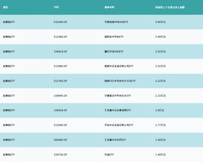 昨日股票型ETF资金流入最多的3支ETF及其流入金额分别为:华泰柏瑞沪深300ETF(流入4.99亿元)、国联安半导体ETF(流入2.99亿元)、嘉实沪深300ETF(流入2.55亿元)。资金流入前10详情见下表: