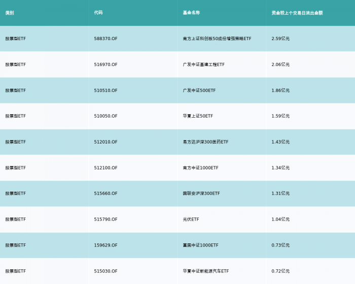 昨日股票型ETF资金流出最多的3支ETF及其流入金额分别为:南方上证科创板50成份增强策略ETF(流出2.59亿元)、广发中证基建工程ETF(流出2.06亿元)、广发中证500ETF(流出1.86亿元)。资金流出前10详情见下表: