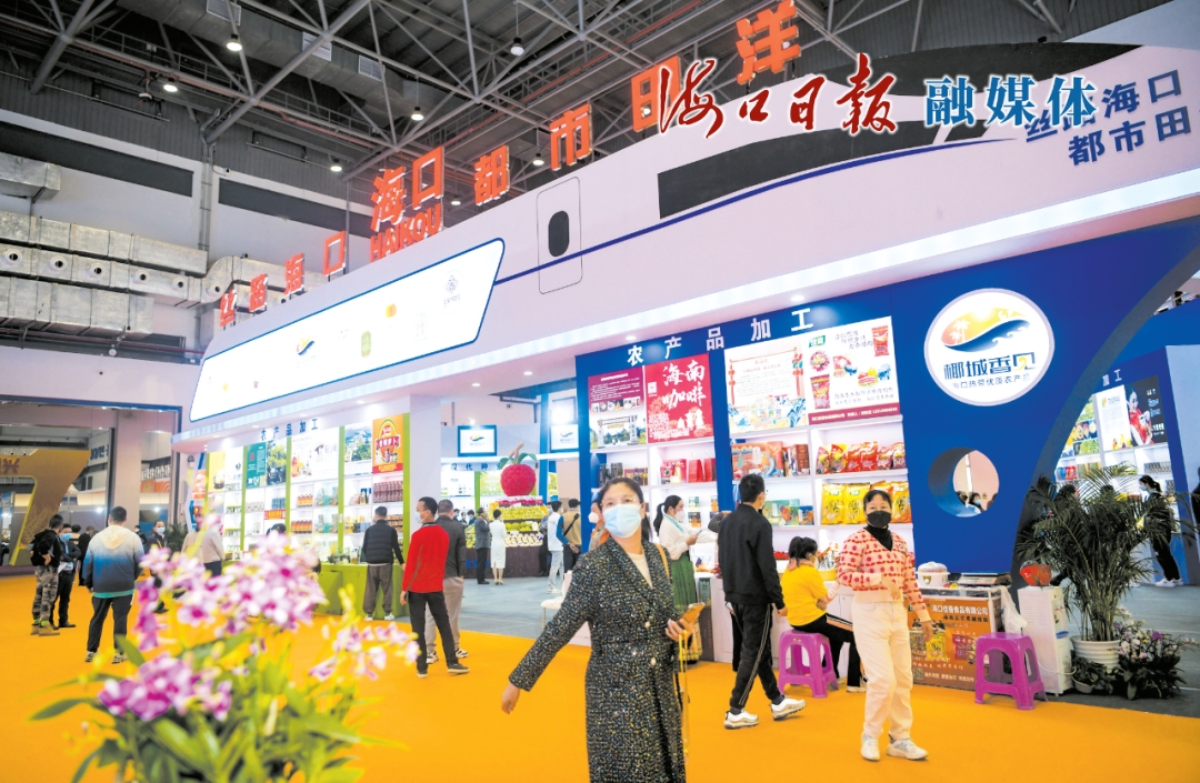(12月15日,在2022年海南冬交会上,海口馆展品吸引参展人员驻足参观。)