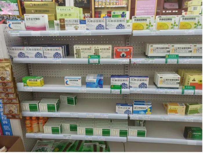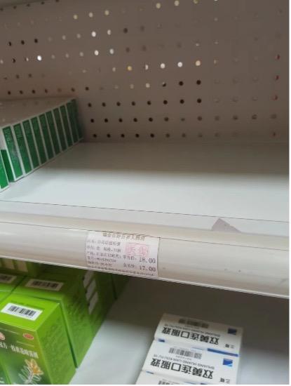 12月15日,记者走访江西瑞金城区内9家药房,每家药房内放置“清热解毒”类感冒用药的货架,几乎都只剩零星几种药品杂乱摆放,在9家药店里没能找到一盒连花清瘟颗粒或胶囊类药物。“最近太多人来买药了,我们也不知道什么时候能补上货。”药店工作人员看着空空如也的货架不由得苦笑起来。