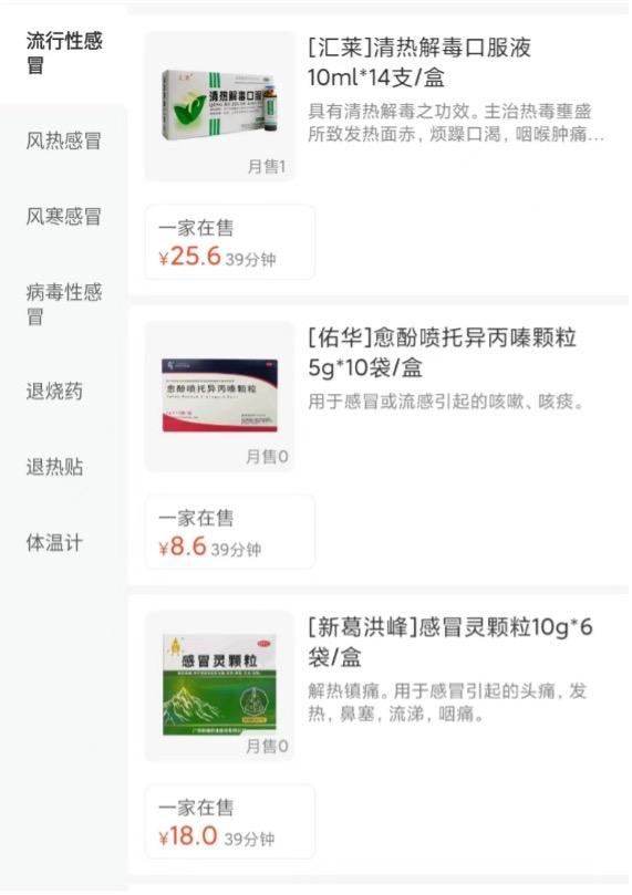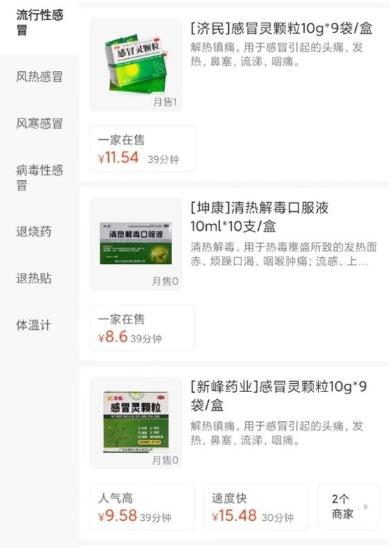 而在线上的“美团买药”服务中,药品的紧缺更加明显。在“感冒用药”一类中,许多常见药品在全城十几家药店里仅一家在售,如“感冒灵颗粒”、“清热解毒口服液”等等,更不用说“布洛芬”等药物早已全城断货。