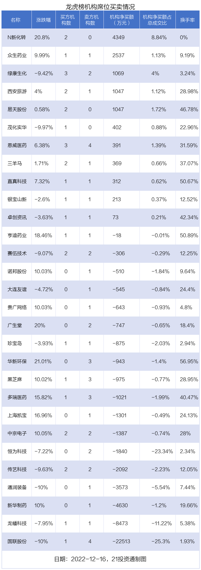 12月16日,29只个股龙虎榜出现了机构的身影,机构合计净卖出4.06亿元。具体来看,机构净买入11股,净卖出18股。