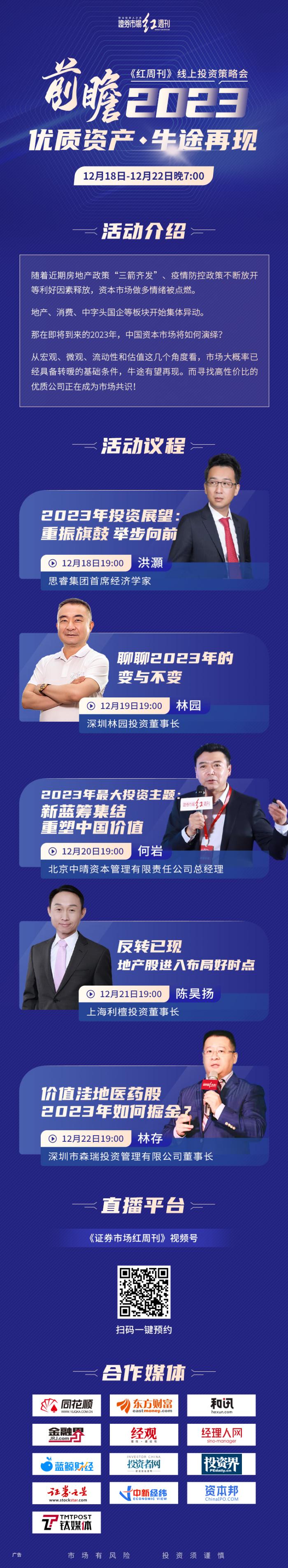 本次线上投资策略会将邀请林园、洪灏、何岩、林存、陈昊扬5位国内知名机构投资者,做客《红周刊》,与投资者共同前瞻2023年中国资本市场走向,寻找优质资产中的布局机会。