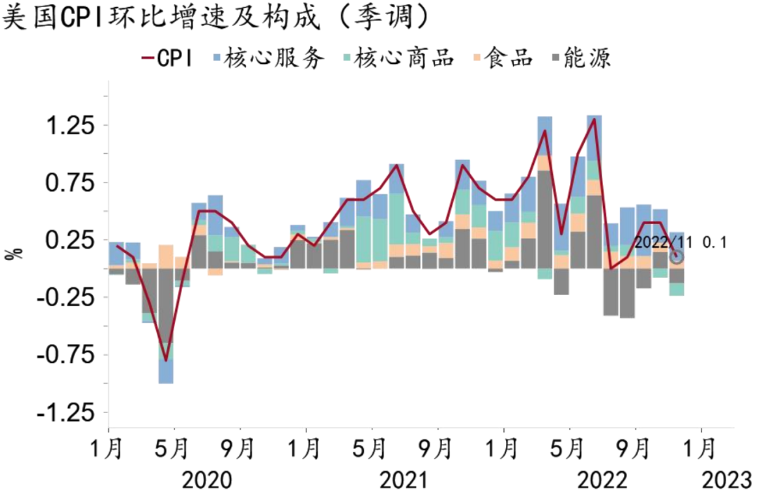 商品通胀超预期回落连续第二个月令美国CPI通胀数据大幅低于预期,美联储加息步伐首次确认放缓,12月加息50bp,明年预计仍将加息2次,合计加息幅度为50bp,加息周期高点或位于4.75%。若通胀持续快速回落,美联储政策利率将于明年一季度成功追上通胀曲线,实际利率由负转正,对美国经济收缩作用加剧。美国经济衰退及美联储货币政策转向的时点或相应提前。