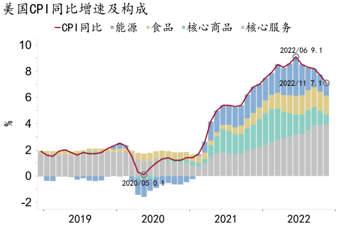 11月美国CPI通胀7.1%(预期7.3%),较前值回落0.6pct;核心CPI通胀6.0%(预期6.1%),较前值回落0.3pct。