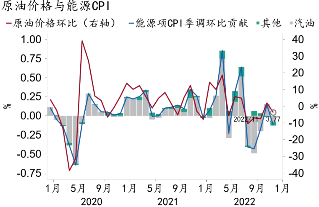 能源项CPI通胀在基数效应影响下连续第五个月回落,环比亦在下跌,与国际油价走势相一致。11月能源项同比增速13.1%,较前值回落4.5pct,对CPI通胀贡献为1.0pct,连续第五个月下跌;环比增速-1.6%,较前值回落3.4pct。