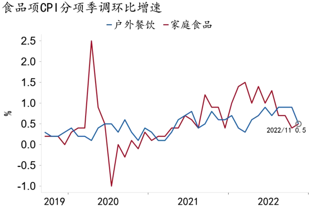 核心商品通胀延续超预期回落,环比连续两个月大幅下跌。11月核心商品同比增速3.7%,较前值回落1.4pct,对CPI通胀贡献0.8pct;环比增速-0.5%,较前值回落0.1pct。