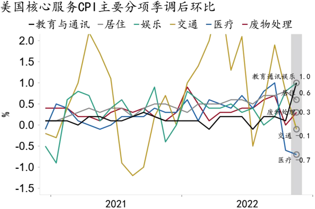 从分项看,主要服务分项环比增速均在外因影响下回落。房租项环比小幅回落0.1pct至0.6%;医疗项环比小幅回落0.1pct至-0.7%,前者受房价见顶回落影响,后者则主要受1-2年前医保分项数据影响;交通服务项环比较前值回落0.9pct至-0.1%,主因是汽车及其零部件价格回落导致的租赁、维修服务价格回落。