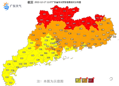预计,受强冷空气影响,17日我省各地气温持续下降,18日-19日我省大部晴冷,将有大范围的5℃以下低温,中北部市县有冰(霜)冻,过程最低气温出现在18日或19日早晨:粤北零下4℃~0℃(高海拔山区零下6℃~零下4℃),广州市区2℃~3℃。17-19日南海中北部海面有7-9级阵风10-11级大风。