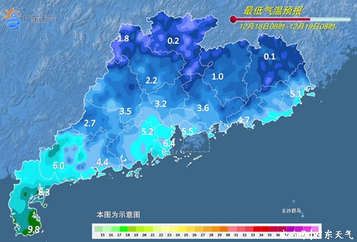 18日-19日,我省大部晴天,早晚气温低,昼夜温差大。最低气温:粤北零下4℃~0℃(高海拔山区零下6℃~零下4℃),南部市县4℃~7℃,其余市县1℃~4℃。