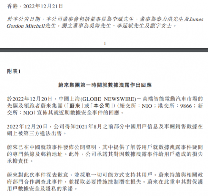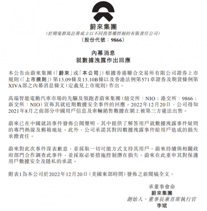 12月21日,蔚来在港交所公告,2022年12月20日,公司得知2021年8月之前部分中国用户信息及车辆销售数据在网上被第三方违法出售。蔚来已在中国就该事件发布公开声明,其中提供了解答用户就数据泄露事件疑问的专门热线及邮箱地址。此外,公司承诺其对因数据泄露事件给用户造成的损失承担责任。蔚来对此次事件深表歉意,并采取一切可能方式支持其用户。蔚来持续与相关政府部门合作调查此事件,并采取必要措施控制潜在损失。