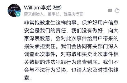 20日深夜,蔚来创始人兼董事长李斌在蔚来官方社区就用户数据泄露一事发文致歉。