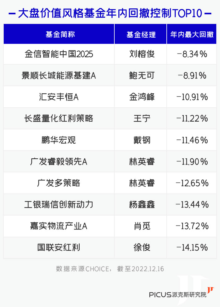 大盘价值风格的基金,在防守上更有优势,年内平均最大回撤约20%,好于成长风格的主动基金。其中表现最好的,是刘榕俊管理的金信智能中国2025,年内最大回撤约-8.34%。该基金的名字看上去很“有成长风格,实际上近五年来基金重仓银行,算是一只银行主题基金了。