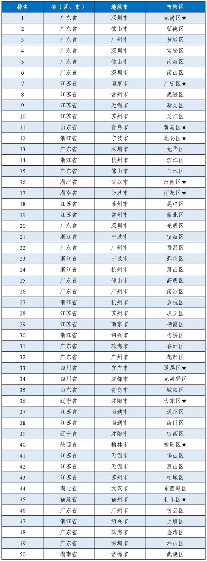 工业百强区榜单,也集中于广东、江苏、浙江、福建等东部省份,其中广东省占据22席,江苏省占据19席,浙江省占据18席,山东占据9席。