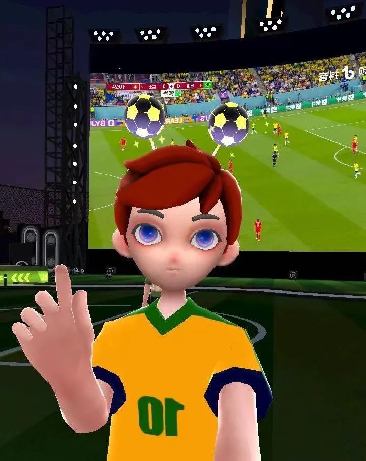 一个出圈的案例是“自拍功能”。 在社交媒体上,有的用户晒出了专属Avatar虚拟形象的自拍,还有的用户则秀出了在《世界杯狂欢夜》中与明星的合影。区别于世界杯移动端社交的“距离感”,PICO提供的各类道具、表情包以及《守门大作战》足球小游戏,大大增强了世界杯VR的互动性,凸显出VR的沉浸感。