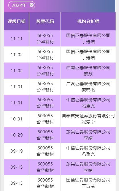 接下来我们关注一下公司近年的分析师评级热度。公司在2017年9月上市,当年并无分析师为公司发布点评。随着公司在2018年4月交出一份靓丽的2017年业绩答卷,开始吸引到分析师为公司作出点评,当年公司共收获14次分析师评级。在2018年至2020年的年报中,由于公司业绩逐渐出现萎缩,因此分析师评级次数在2019年至2020年的也骤然下滑,分别为9次、1次。由于公司把握行业机遇,坚定地大举扩建产能,因此公司2021年归母净利润和营业总收入均创下了历史新高,评级热度回升至7次,虽然2021年一季报至三季报业绩均大幅上涨,但当时还未吸引到分析师的“扎堆”关注。直至今年4月份公司公布业绩后,从年初至今公司的评级热度迅速增长至65次,可谓“气势如虹”,其中不乏一些非常优秀的分析师的身影,下面投研君为大家列举一些“大咖”的分析吧。