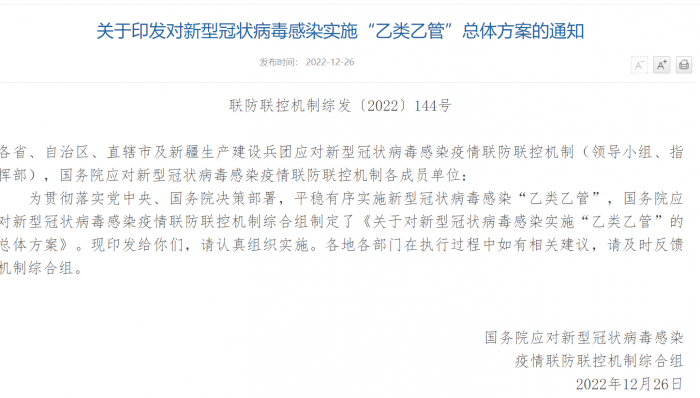 综合评估病毒变异、疫情形势和我国防控基础等因素,我国已具备将新型冠状病毒感染由“乙类甲管”调整为“乙类乙管”的基本条件。