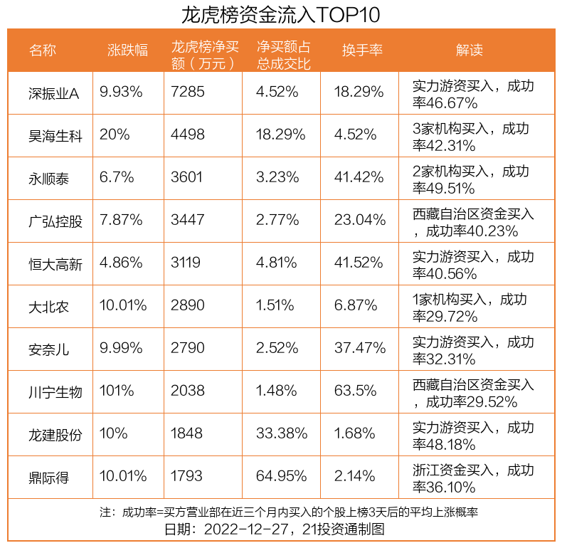 12月27日,上证指数上涨0.98%,深证成指上涨1.16%,创业板指上涨1.2%。盘后龙虎榜数据显示,共有43只个股因当日异动登上龙虎榜,资金净流入最多的是深振业A(000006.SZ),达0.73亿元。