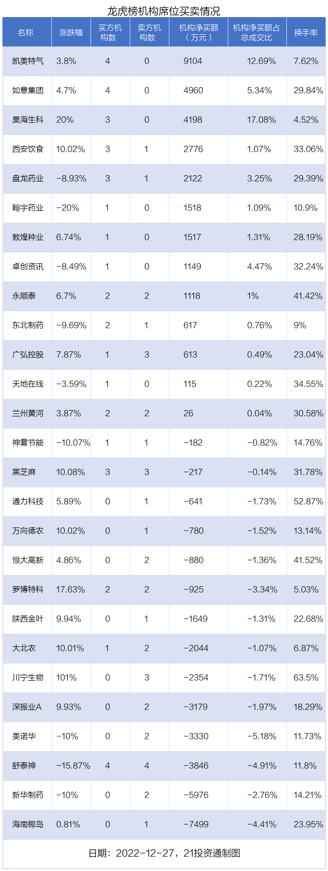 据21投资通智能监测,27只个股龙虎榜出现了机构的身影。沪深股通因圣诞假期暂停交易。