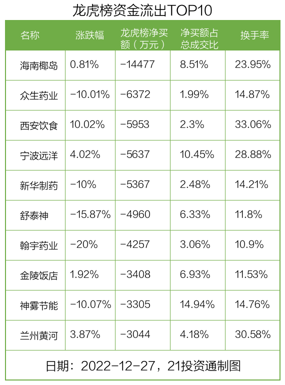 12月27日,27只个股龙虎榜出现了机构的身影,机构合计净卖出3665.23万元。具体来看,机构净买入13股,净卖出14股。