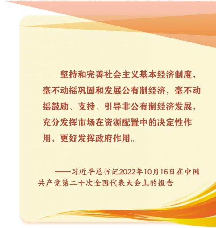 社会主义市场经济体制是中国特色社会主义的重大理论和实践创新,是社会主义基本经济制度的重要组成部分。要按照党的二十大报告部署,坚持和完善社会主义基本经济制度,毫不动摇巩固和发展公有制经济,毫不动摇鼓励、支持、引导非公有制经济发展。