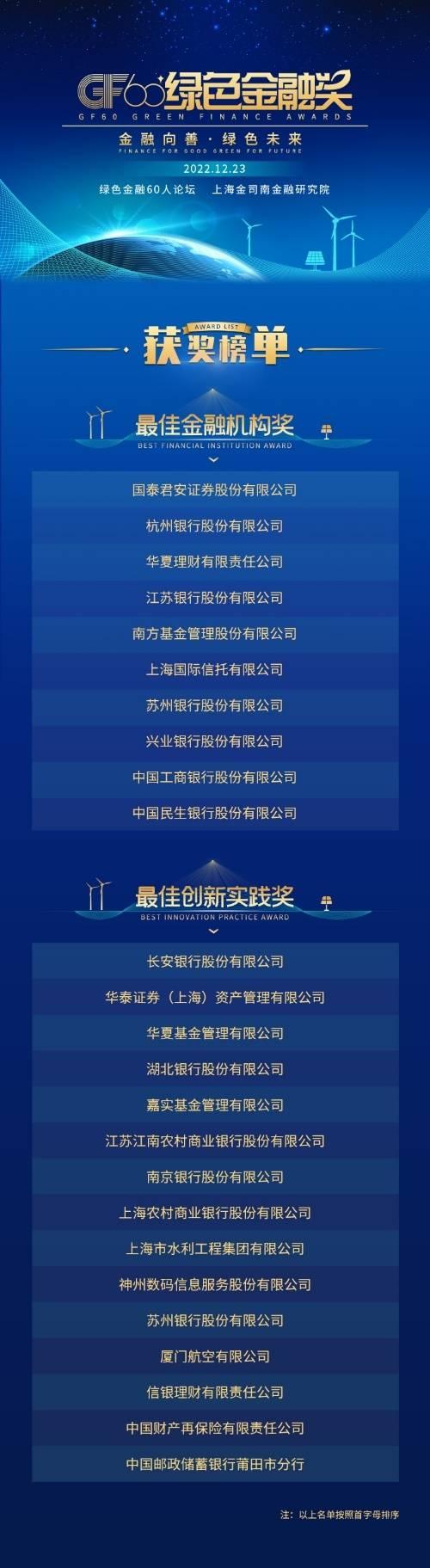 绿色金融60人论坛(简称“GF60”)是非营利性的国际化绿色金融交流平台,由上海金司南金融研究院设立,其汇集全球绿色产业领军机构和金融领域资深专家,旨在推动绿色金融创新与发展,助力实现中国与全球的碳达峰、碳中和战略目标。本届GF60绿色金融奖由绿色金融60人论坛联合专家代表发起,评选收到近百家单位的参评申报,其中10家公司荣获最佳金融机构奖、15家公司的实践案例获得最佳创新实践奖。