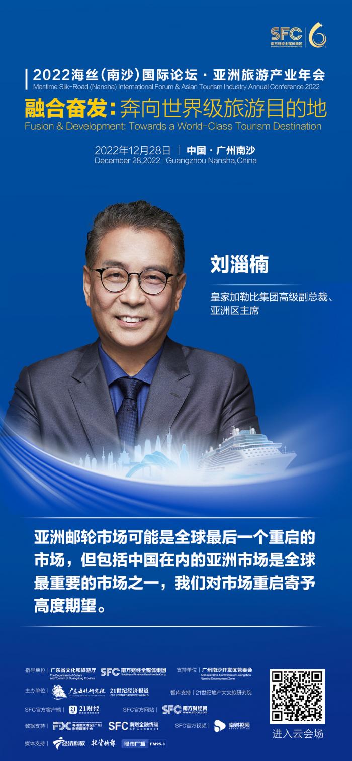 与会期间,皇家加勒比集团高级副总裁、亚洲区主席刘淄楠以《国际邮轮重启与南沙的对接》为主题进行演讲,介绍了全球邮轮市场的恢复情况,重点阐述中国珠三角邮轮市场的重要性,并针对邮轮度假的话题发表了相关见解。
