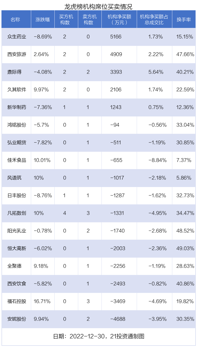 其中,机构净买入金额最多的是众生药业(002317.SZ),当日收盘下跌8.69%,换手率为15.15%。前五大买卖营业部中有2家机构,为合计净买入5166万元,占总成交金额的1.73%。