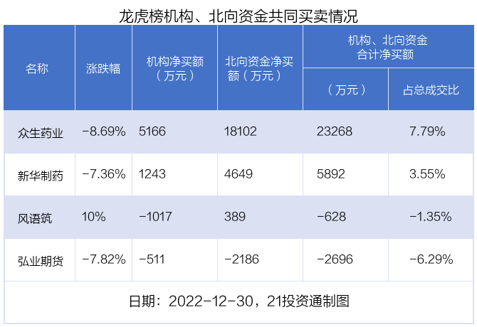 值得注意的是,机构和北向资金共同净买入了众生药业、新华制药;共同净卖出了弘业期货;在风语筑上出现分歧,机构净卖出风语筑1017.21万元,北向资金净买入389.1万元。