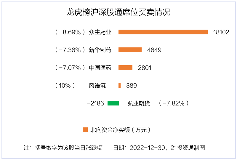 北向资金净买入金额最多的是众生药业(002317.SZ),净买入1.81亿元,占总成交金额的6.06%。净卖出弘业期货(001236.SZ),金额为2185.71万元,占总成交金额的5.1%,当日收盘下跌7.82%,换手率为30.85%。