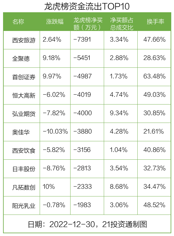 而龙虎榜中资金净流出最多的是西安旅游(000610.SZ),被净卖出为0.74亿元,占总成交金额的3.34%。西安旅游收盘上涨2.64%,换手率为47.66%。