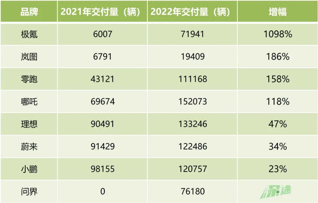跟2021年相比的话,新势力们在2022年都是增长的。其中增速最快的是极氪、岚图、零跑、哪吒,不过一个原因是它们之前的基数小。蔚小理中,理想的增速不错,蔚来、小鹏一般。