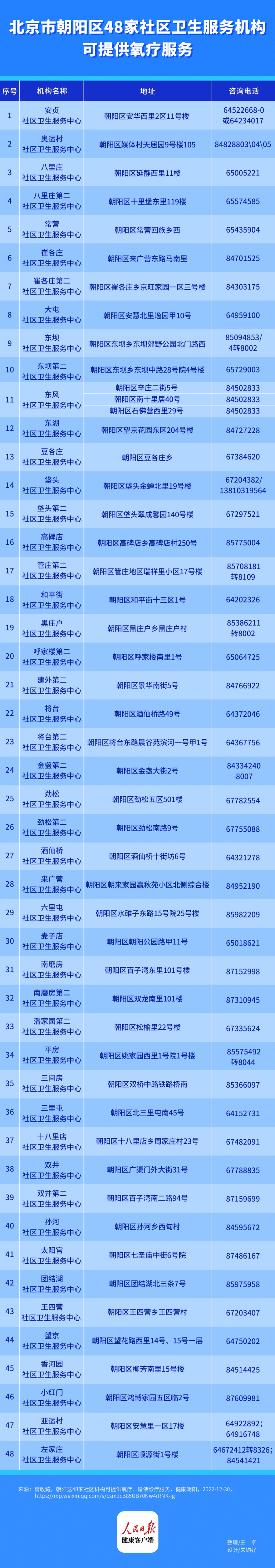据人民日报健康客户端梳理,截至1月1日,北京市朝阳区、海淀区、西城区等多个区公布了可以提供氧疗服务的社区卫生服务中心名单和联系方式,可为居民提供吸氧、灌氧等服务,有需要的市民可以携带医保卡前往就近的社区卫生服务中心。