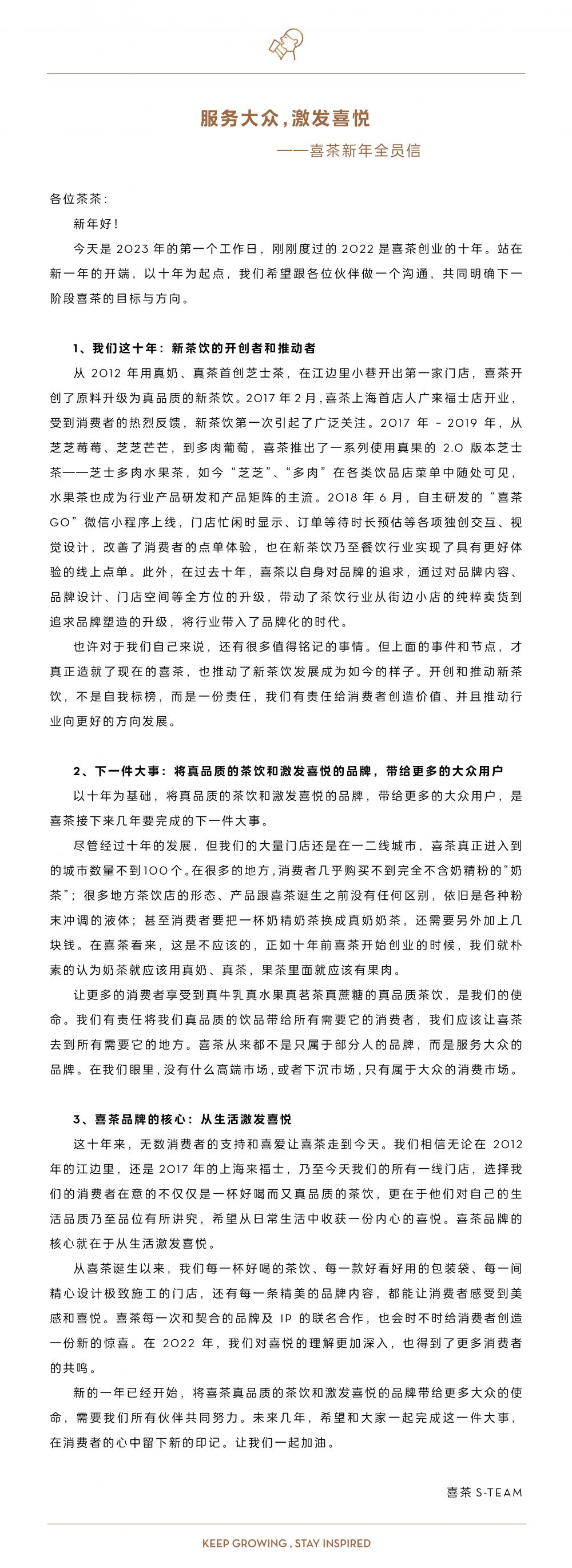 新的一年已经开始,将喜茶真品质的茶饮和激发喜悦的品牌带给更多大众的使命,需要我们所有伙伴共同努力。未来几年,希望和大家一起完成这一件大事,在消费者的心中留下新的印记。让我们一起加油。
