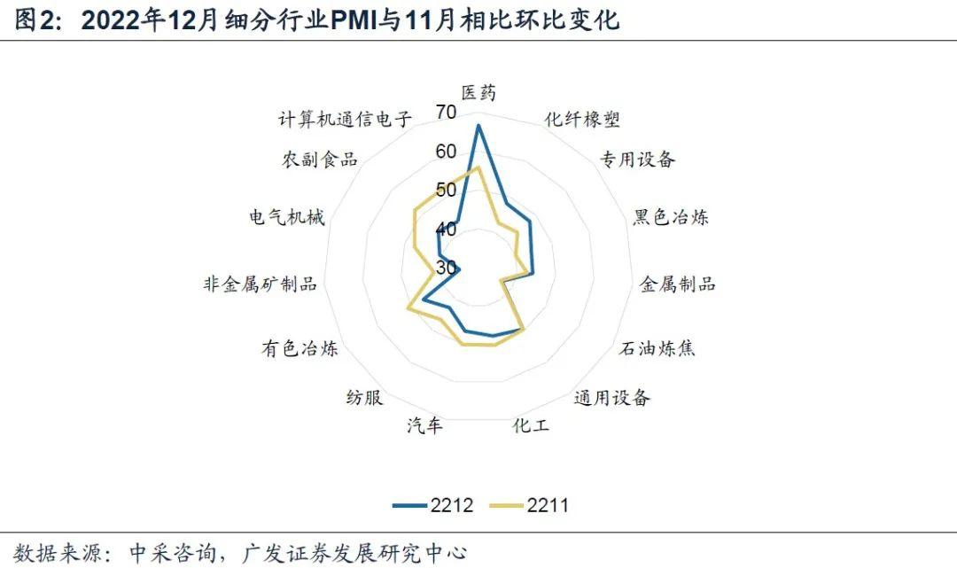 12月仍有6个细分行业景气逆势环比改善,其背后的宏观线索主要有三:一是疫情达峰过程中对医药品和医疗器械等专用设备需求的短期高增长;二是“保交楼”支撑黑色、金属等建安环节产品需求改善;三是随着第一批城市居民生活半径修复,航空等景气回升带来石油炼焦景气环比回升。