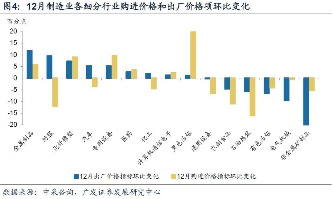 12月出厂价格和购进价格环比分别上行1.6和0.9个点,出厂价格改善幅度快于购进价格,指向利润空间的低位改善;通用设备、汽车、农副食品、纺服、石油炼焦、化工等行业尤为显著。