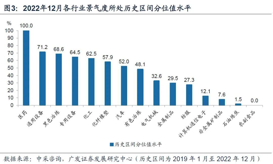 第四,12月仍有6个细分行业景气逆势环比改善,其背后的宏观线索主要有三:一是疫情达峰过程中对医药品和医疗器械等专用设备需求的短期高增长;二是“保交楼”支撑黑色、金属等建安环节产品需求改善;三是随着第一批城市居民生活半径修复,航空等景气回升带来石油炼焦景气环比回升。