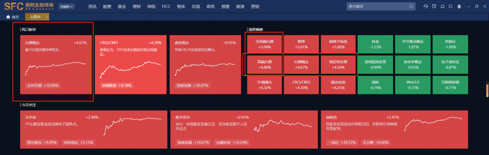 1月5日A股白酒板块强势大涨,延续了昨日开门红趋势。南财金融终端主题库显示,白酒相关主题纷纷大涨,白酒概念主题上涨4.67%,次高端白酒主题上涨5.04%,高端白酒主题上涨4.89%,地区特色酒主题上涨4.5%。核心成分股中,古井贡酒涨停,迎驾贡酒涨超8%,泸州老窖、五粮液涨超5%,贵州茅台上涨4.41%重回1800元。