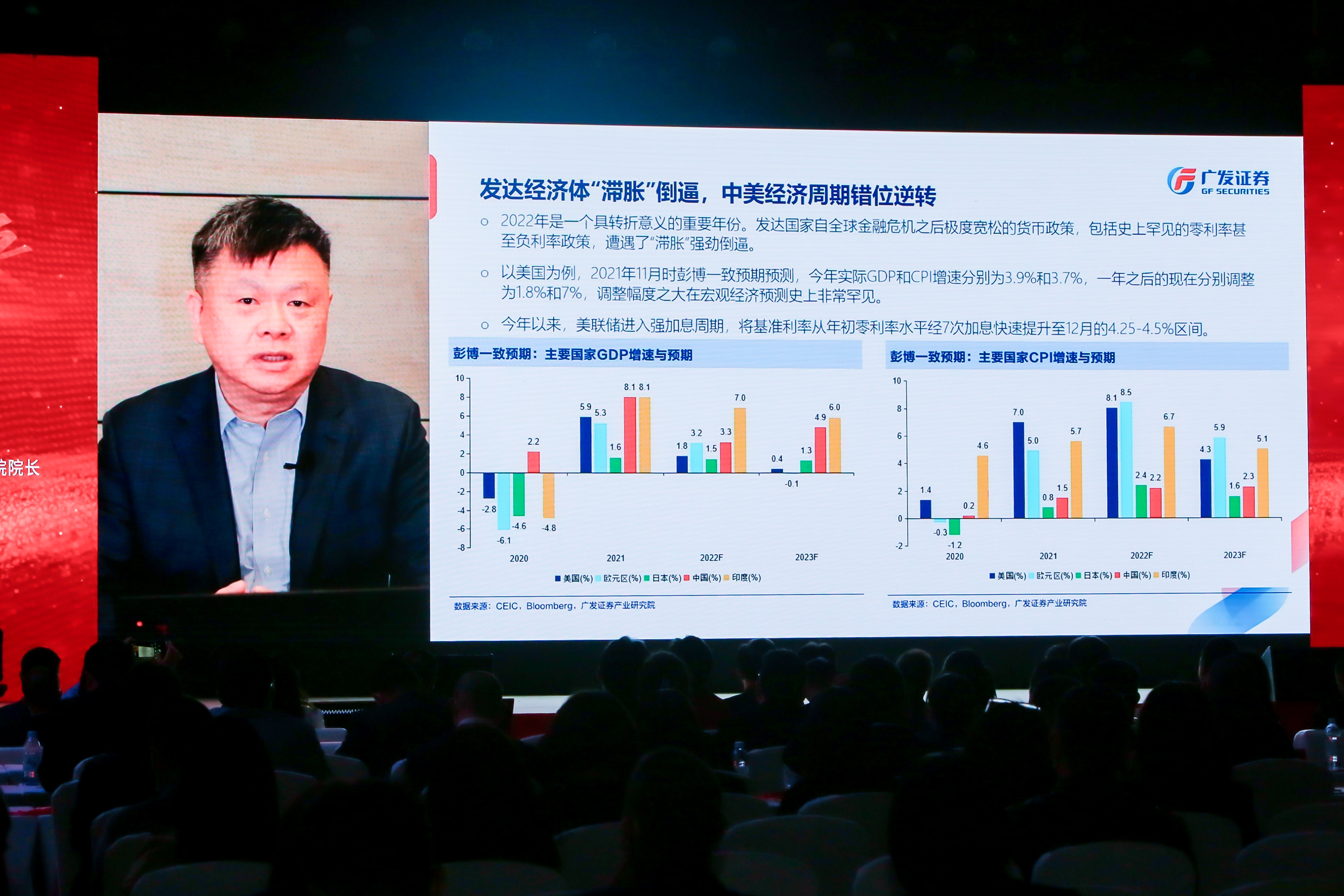 中美经济总体是处在一个错位的阶段,美国由于经济过热、通胀加息,而我们面临疫情等压力,经济下行的压力。所以这两个之间,2023年有可能会出现逆转,美国经济可能持续下行,不排除发达经济体有衰退的风险。那么我们中国经济相对来讲,有可能在低位反弹,明年复苏的确定性是比较高的。所以这里面实际上从彭博一致预期的角度,大家也看得非常清楚,明年对美国GDP的预测增长是0.4%,对我们中国的预测是5%左右,实际上我们是认为有可能会更高。
