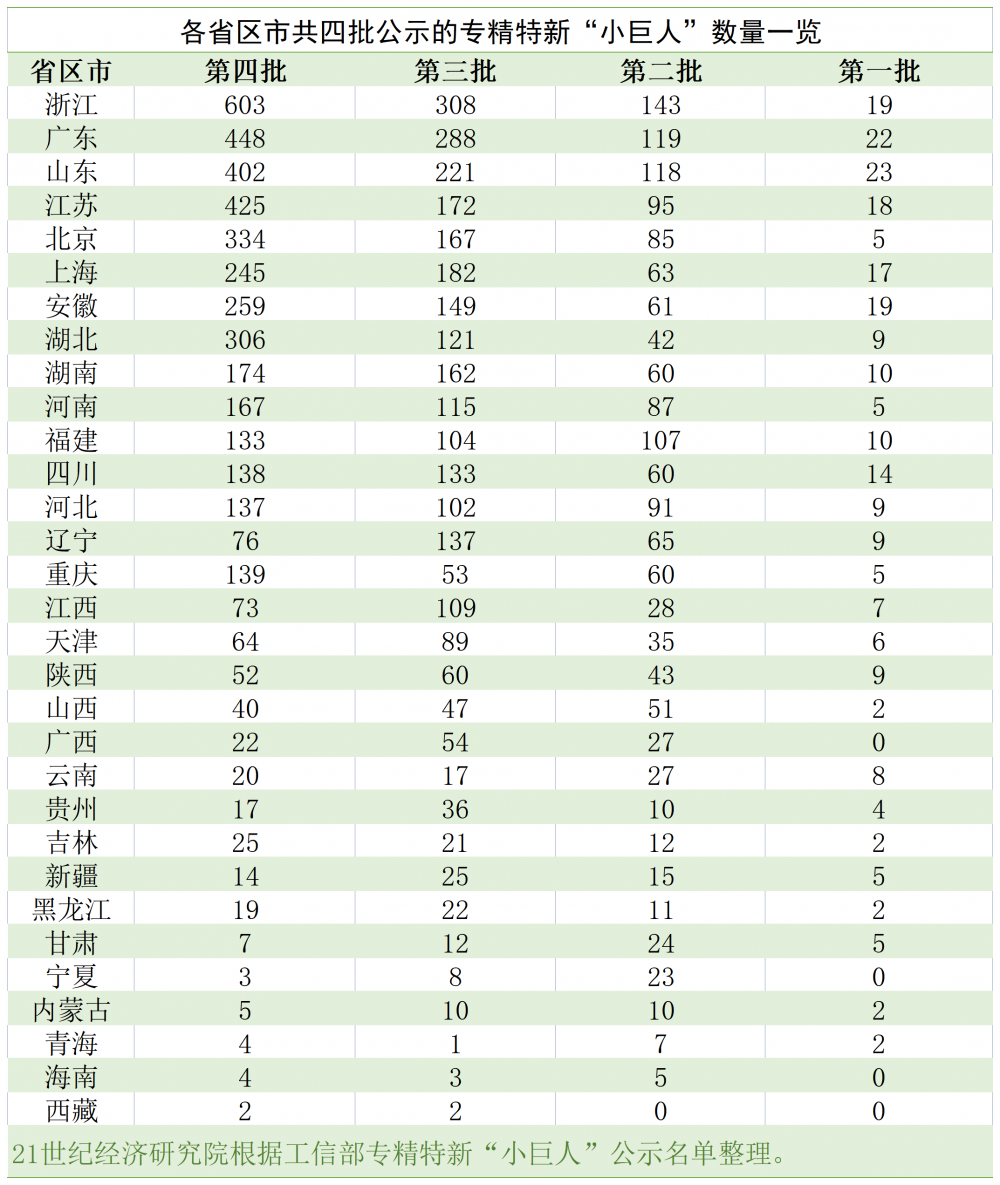 从省份来看,浙江、广东、山东、江苏、北京、上海、安徽、湖北、湖南、河南、福建、四川、河北等省份在2022年新增“小巨人”企业均超过100家,表现较为突出,多个省份第四批“小巨人”企业新增数量超出前三批总和。