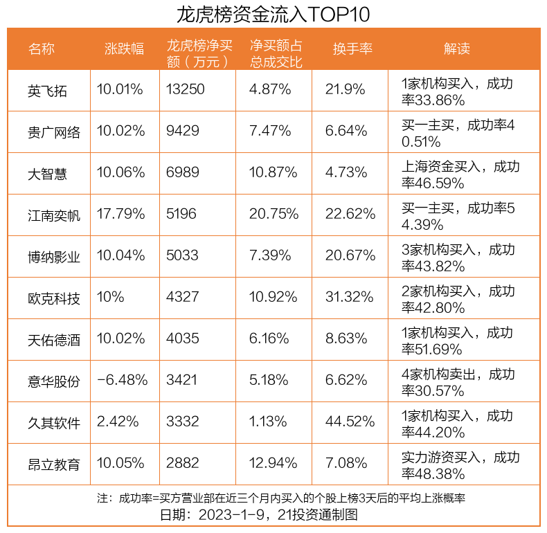 1月9日,上证指数上涨0.58%,深证成指上涨0.73%,创业板指上涨0.75%。盘后龙虎榜数据显示,共有31只个股因当日异动登上龙虎榜,资金净流入最多的是英飞拓(002528.SZ),达1.33亿元。