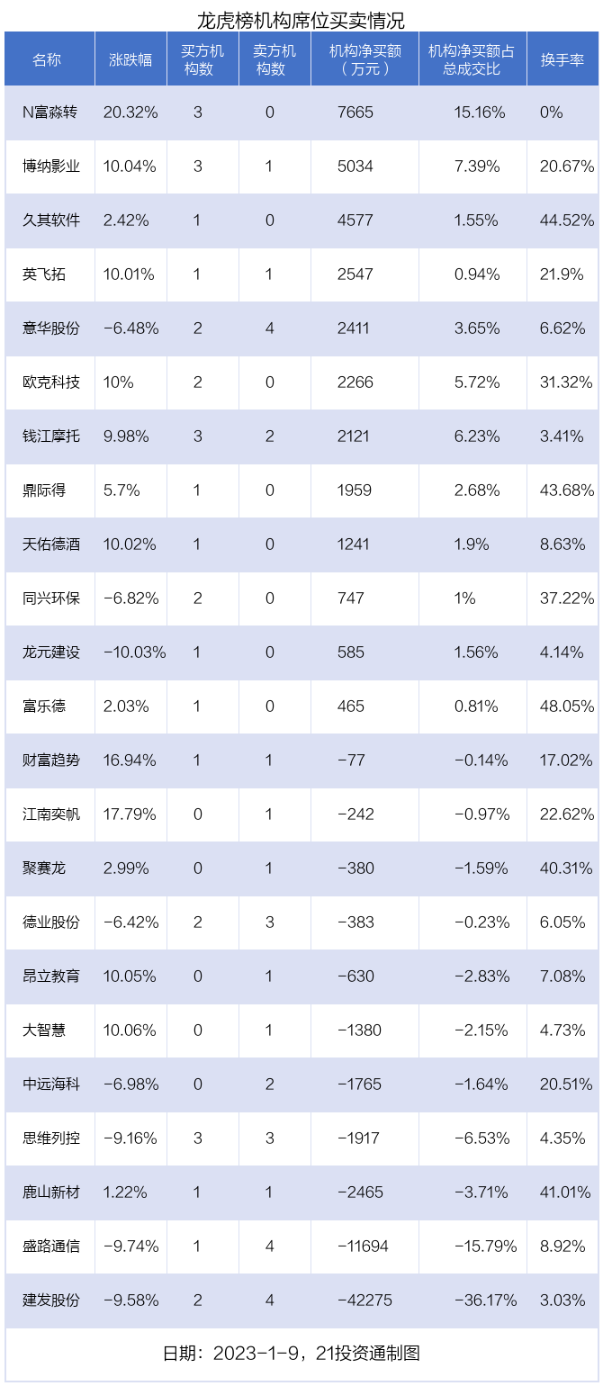 1月9日,23只个股龙虎榜出现了机构的身影,机构合计净卖出3.16亿元。具体来看,机构净买入12股,净卖出11股。