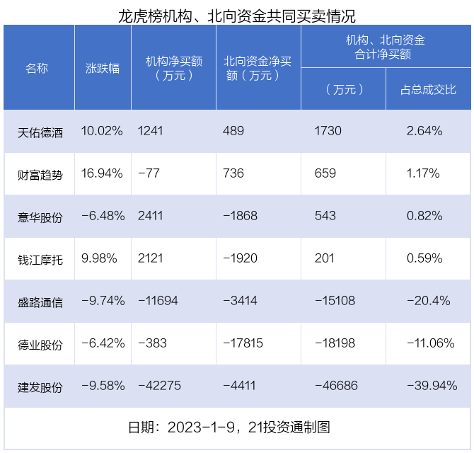 值得注意的是,机构和北向资金共同净买入了天佑德酒;共同净卖出了盛路通信、建发股份、德业股份;在财富趋势、意华股份、钱江摩托上出现分歧。