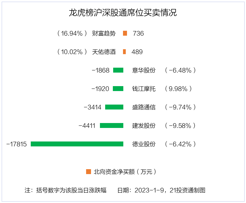 1月9日,北向资金参与龙虎榜中的个股共有7只,合计净卖出2.82亿元。其中沪股通净买入1股,净卖出2股,合计净卖出2.15亿元;深股通净买入1股,净卖出3股,合计净卖出6712.49万元。