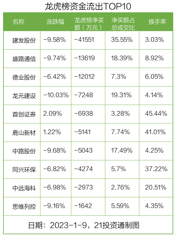 而龙虎榜中资金净流出最多的是建发股份(600153.SH),被净卖出为4.16亿元,占总成交金额的35.55%。建发股份收盘下跌9.58%,换手率为3.03%。