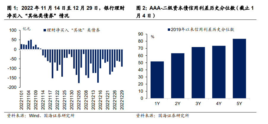 2022年11月中旬银行理财“赎回潮”开启以来,负债端压力使得银行理财部分抛售持有的二级资本债。从二级市场成交数据来看,2022年11月14日至12月29日,银行理财持续净卖出包含二级资本债在内的“其他类债券”超3000亿元,推动二级资本债信用利差阶段性走阔。截止2023年1月4日,AAA-二级资本债各期限信用利差,均位于2019年以来历史分位数的50%以上。