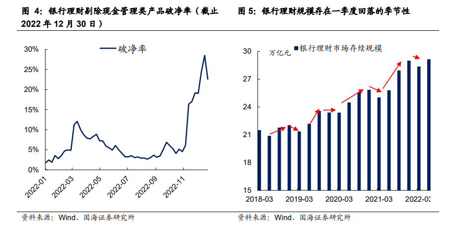 根据我们的测算,截止2022年12月30日,全市场银行理财剔除现金管理类产品的破净率为22.6%,尽管从高位回落,但绝对水平仍然较高。在此背景下,若银行理财到期规模较高,散户投资者有较大概率因为不满意产品业绩表现而选择赎回产品,产品投资端将被迫抛售持有的二级资本债。