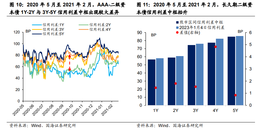 类似的案例,我们可以参考2020年5月至2021年2月的“债熊”行情。在此期间,受“降久期”策略的影响,1Y-2Y二级资本债配置盘相对较多,信用利差中枢较低;3Y-5Y二级资本债配置盘相对缺乏,信用利差中枢较高。