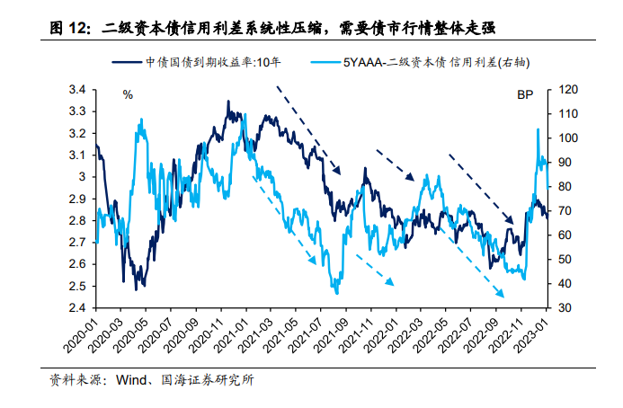 长期来看,2023年受整体信贷环境偏弱的影响,二级资本债供给冲击无需担忧。但我们需要考虑《巴塞尔协议III》本土版监管落地后,对二级资本债信用利差中枢长期抬升的作用。