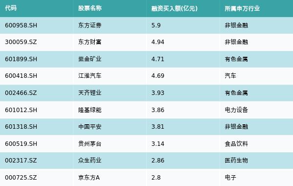 1月9日,两市共有3107只个股有融资资金买入,其中东方证券、东方财富、紫金矿业排名前三,买入金额分别5.9亿元、4.94亿元、4.71亿元。融资买入额前10个股详情见下表: